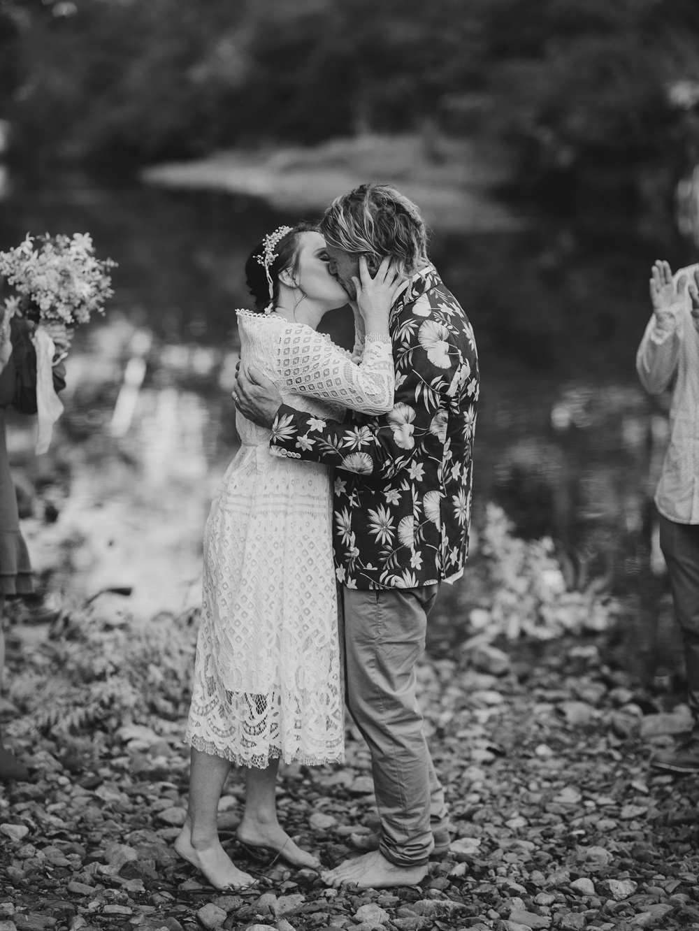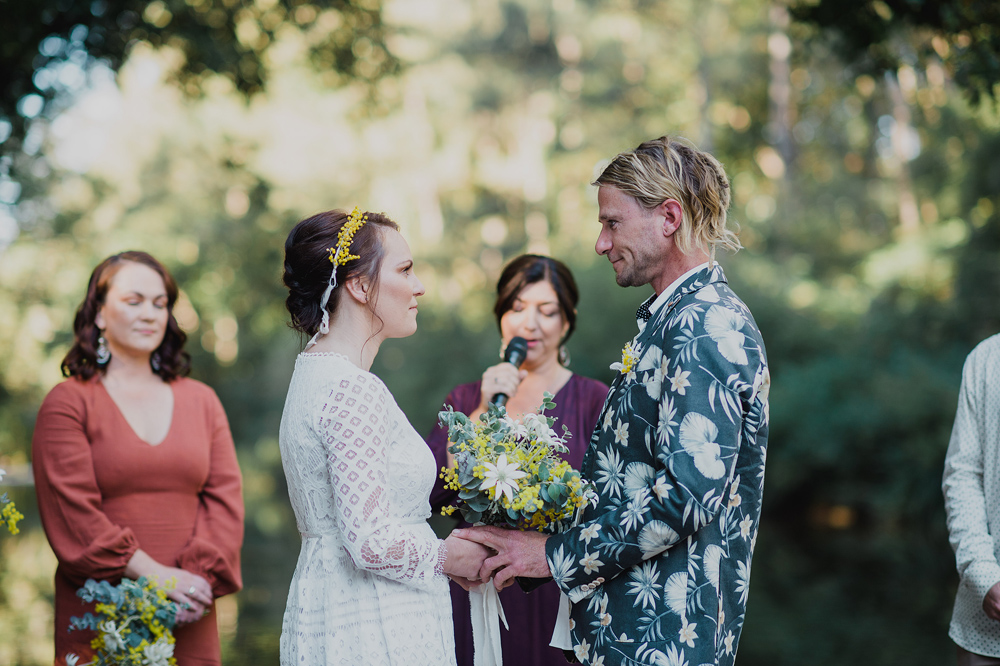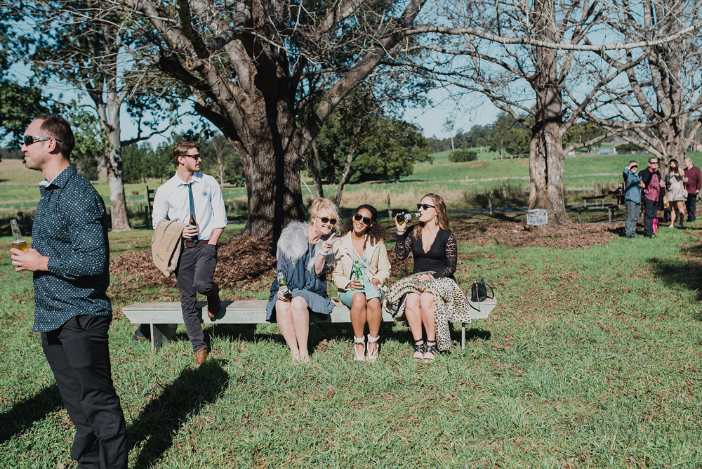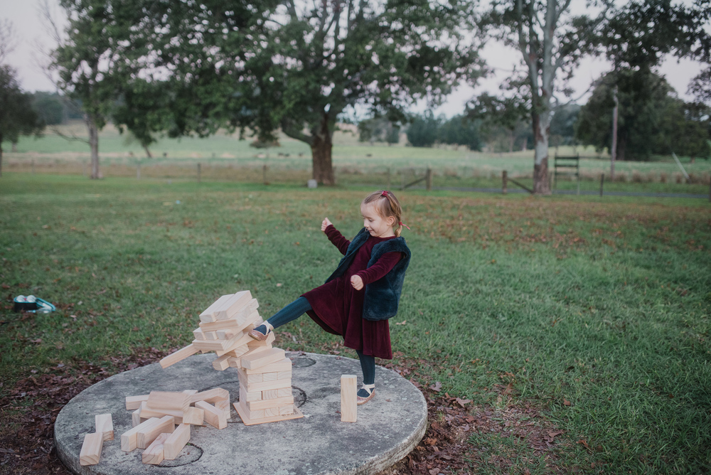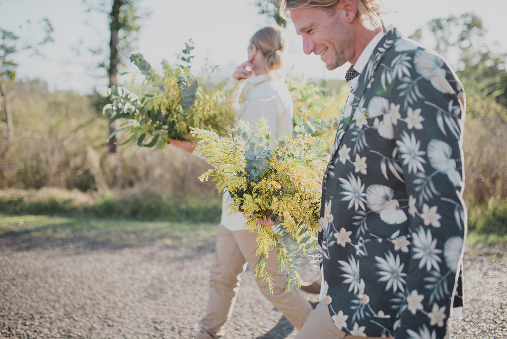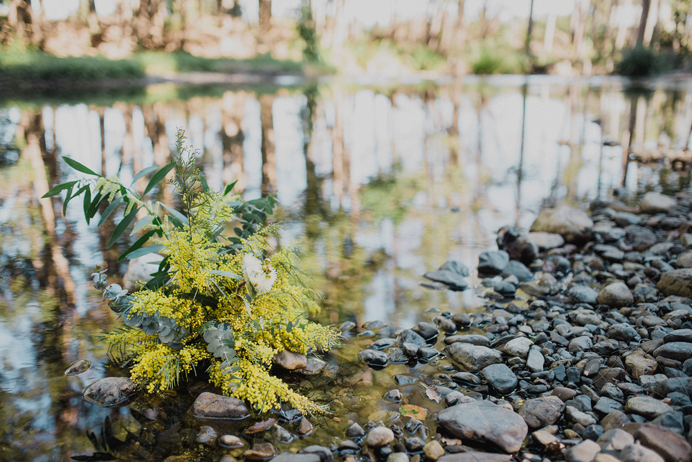 I first met these guys when they brought their little Evie into the world & now here they are making it all official. Steve & Cheree had the most heartfelt & fun wedding on the banks of the Never Never. Steve & his groomsmen led a parade of family & friends along a trail of wattle flowers to the spot where Cheree & her girls stood waiting for them. They exchanged personal vows & signed their Certificate of Marriage on each other’s backs. As the sun dropped the fire was lit & the smell of the wattle bouquets filled the little hall.